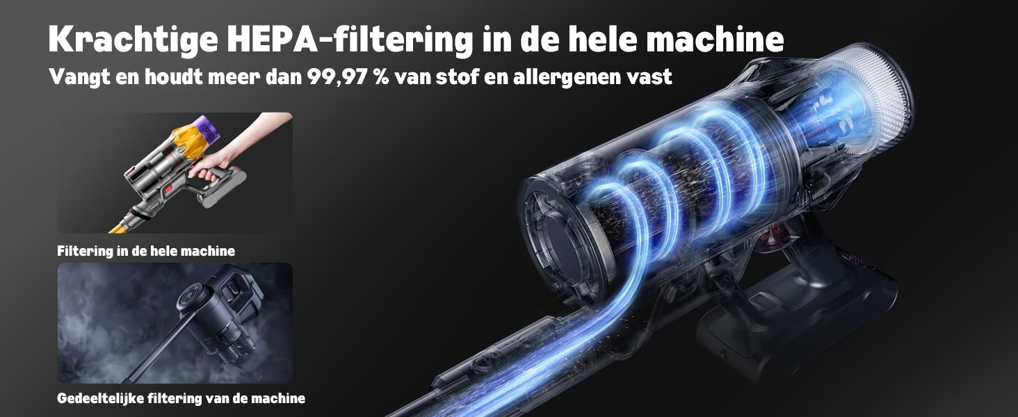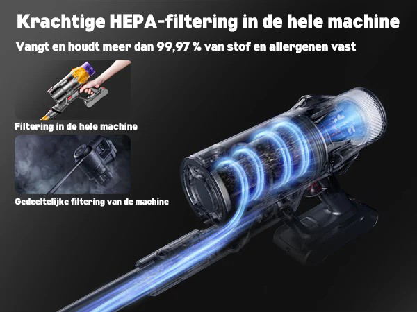 De geavanceerde zuigtechnologie zorgt ervoor dat vuil, stof en dierenharen effectief worden verwijderd.