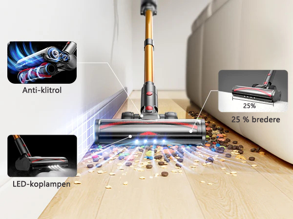 De 25% bredere roller voorkomt dat haren zich oprollen, terwijl de LED-lampjes stof onder meubels zichtbaar maken, waardoor je schoonmaaktijd tot de helft wordt verkort.