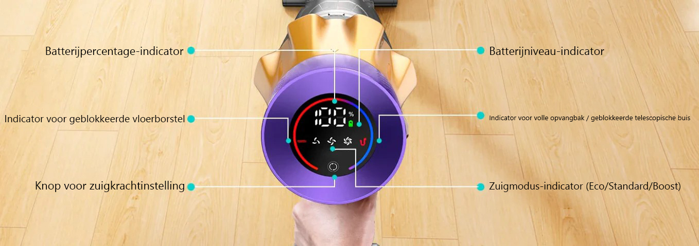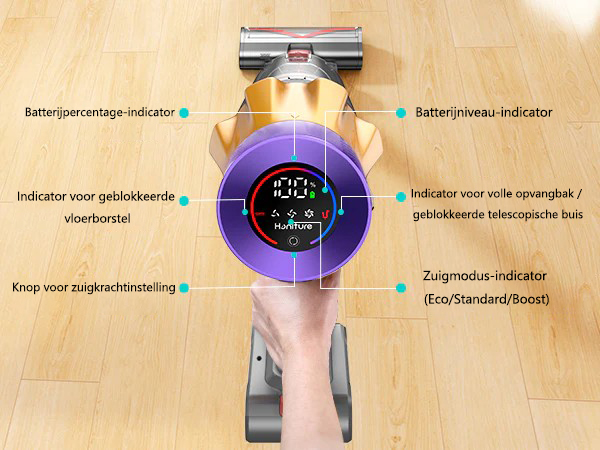 De  stofzuiger heeft een lange batterijduur, waardoor je ononderbroken schoonmaaksessies kunt uitvoeren. Afhankelijk van de ingestelde zuigkracht kun je bij een volle lading enkele uren schoonmaken, in de powermodus tot 30 minuten.